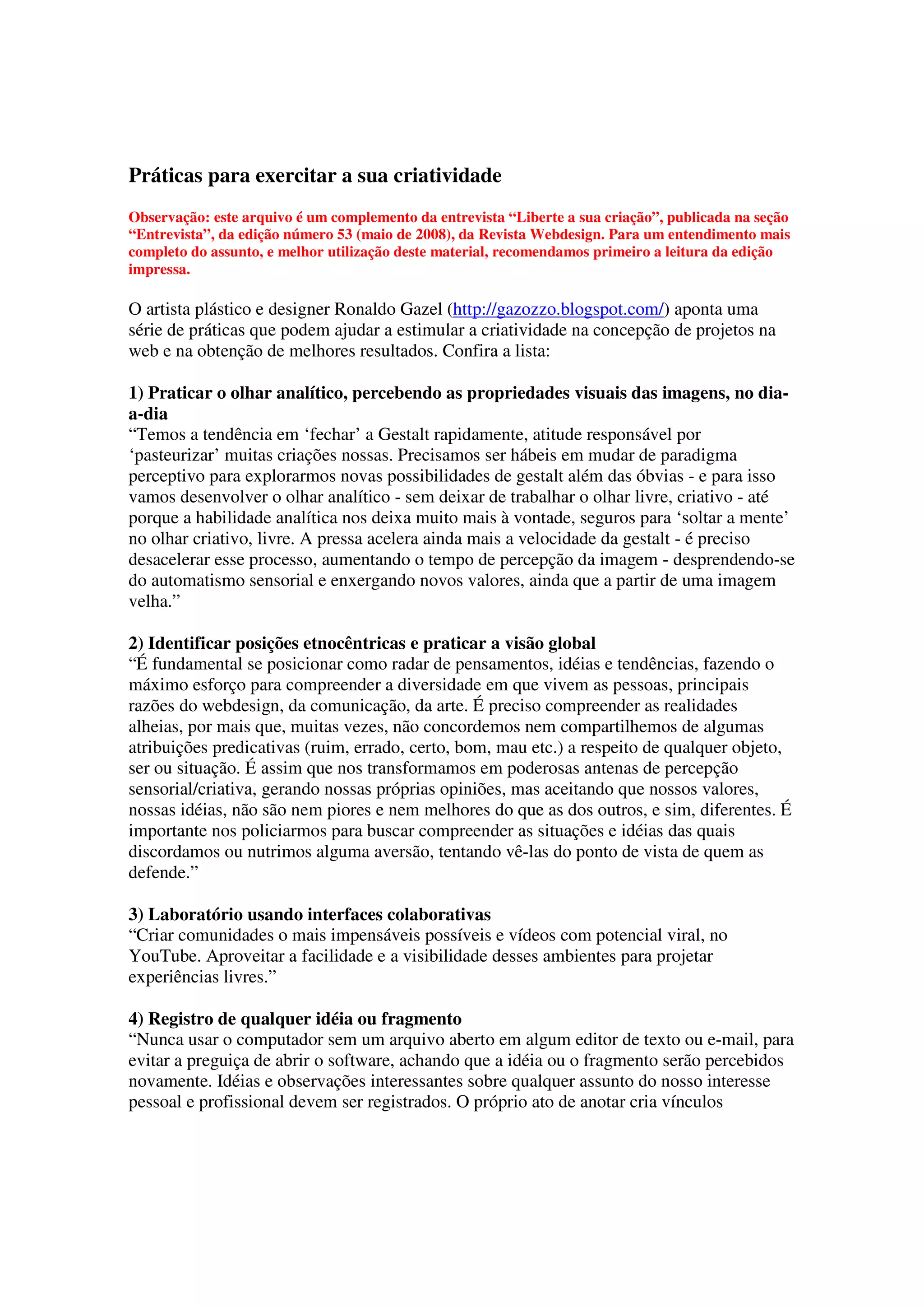 As práticas sugeridas para estimular a criatividade incluem: 1) praticar o olhar analítico percebendo propriedades visuais das imagens no dia-a-dia; 2) identificar posições etnocêntricas e praticar uma visão global; 3) usar laboratórios colaborativos online para projetar experiências livres.