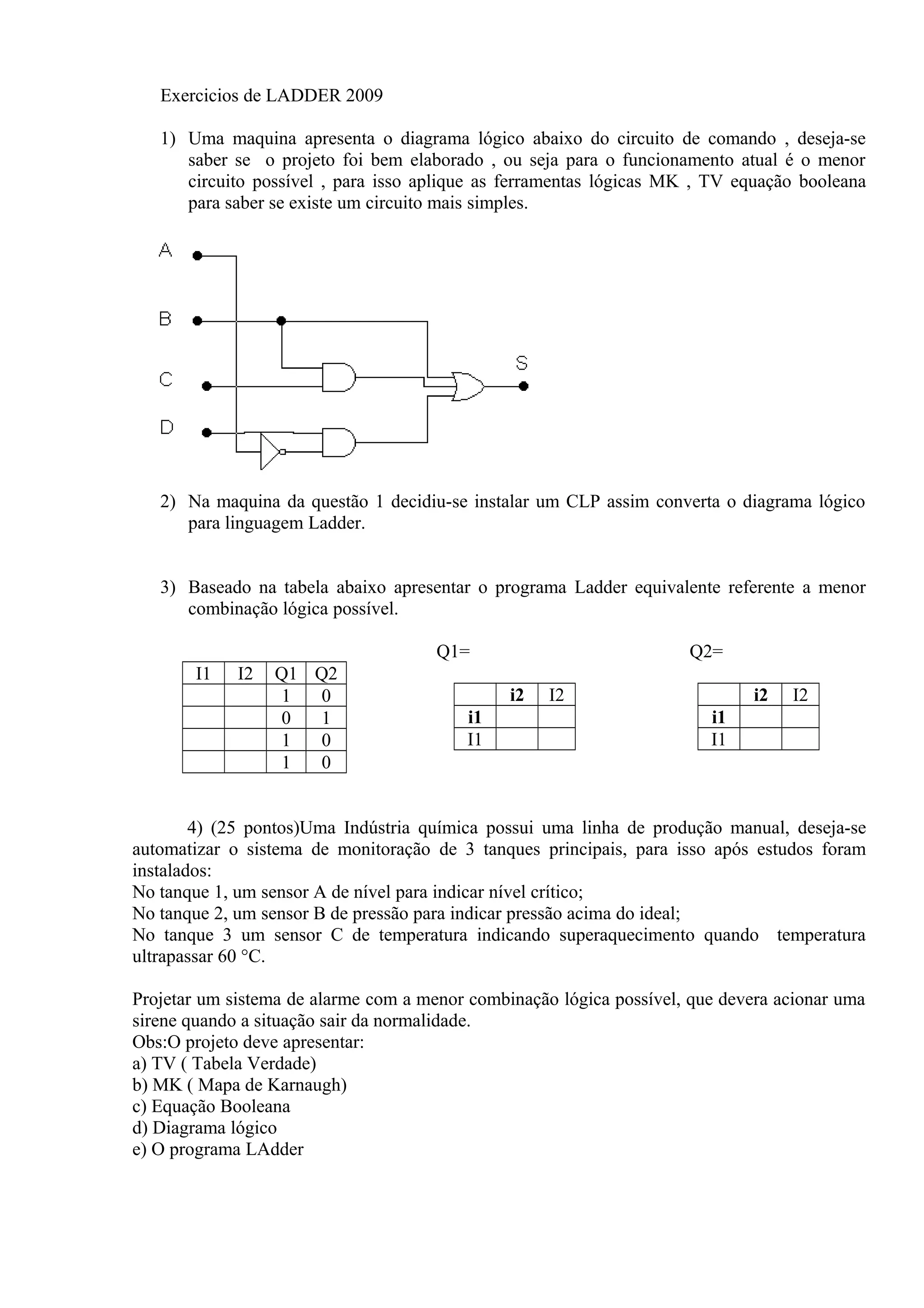 3) Apresentar o programa Ladder equivalente à menor combinação lógica possível baseado em uma tabela dada.