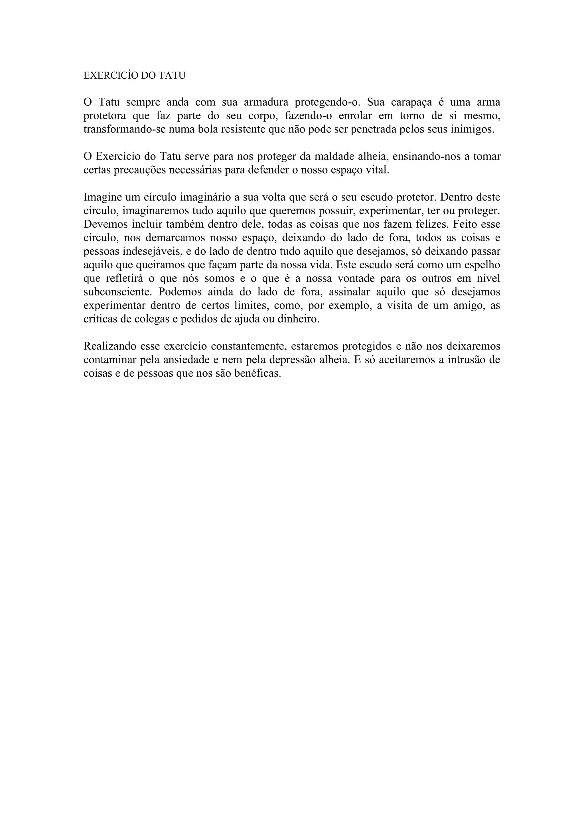 O tatu sempre anda protegido por sua carapaça, que o transforma em uma bola resistente para se proteger dos inimigos. O exercício do tatu ensina a criar um círculo imaginário ao redor para demarcar nosso espaço vital e proteger tudo que nos faz felizes, deixando fora tudo indesejável. Ao realizar constantemente esse exercício, estaremos protegidos contra ansiedade e depressão alheias e só aceitaremos intrusões benéficas.