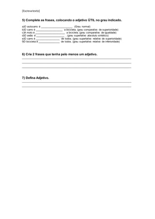 Este documento é uma atividade escolar sobre adjetivos. Contém exercícios para identificar e classificar adjetivos em frases, formar o plural de frases, comparar graus de adjetivos e criar frases com adjetivos.
