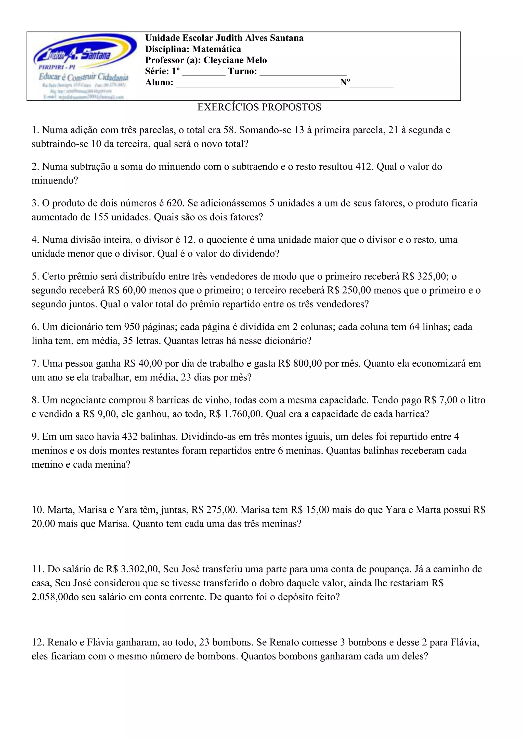 Um documento contendo 12 exercícios de matemática para alunos do 1o ano do ensino fundamental, cobrindo tópicos como adição, subtração, multiplicação, divisão, porcentagem e razão e proporção.