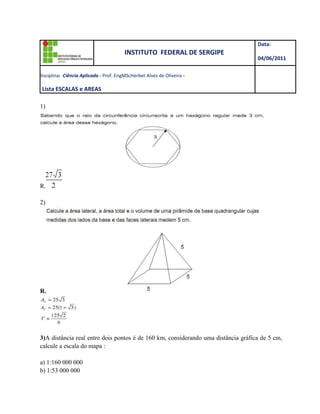 1) O documento apresenta uma lista de exercícios sobre escalas e áreas em mapas.