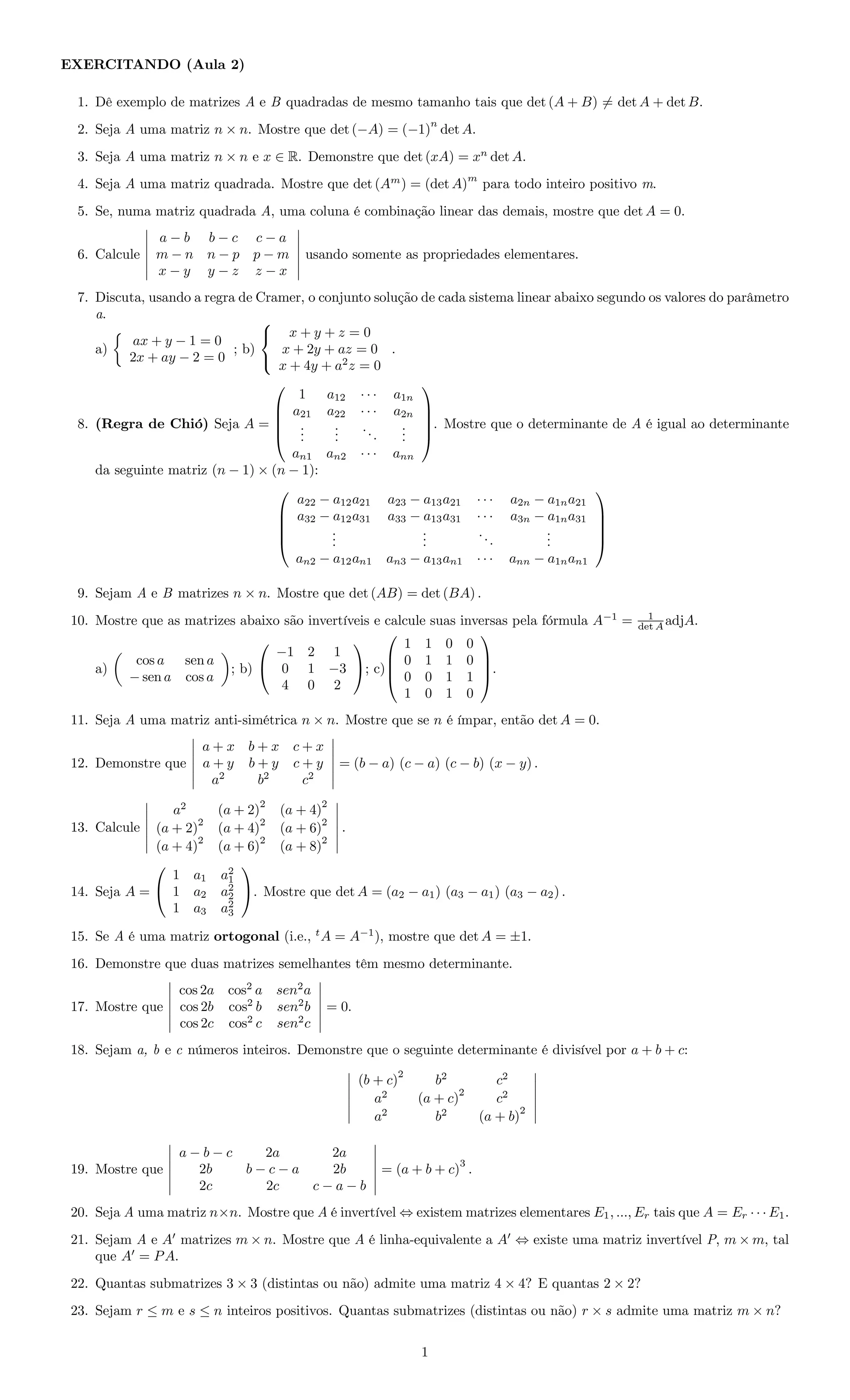 1. O documento apresenta exercícios sobre determinantes de matrizes, incluindo propriedades como det(A+B)=detA+detB e det(-A)=(-1)^n detA.