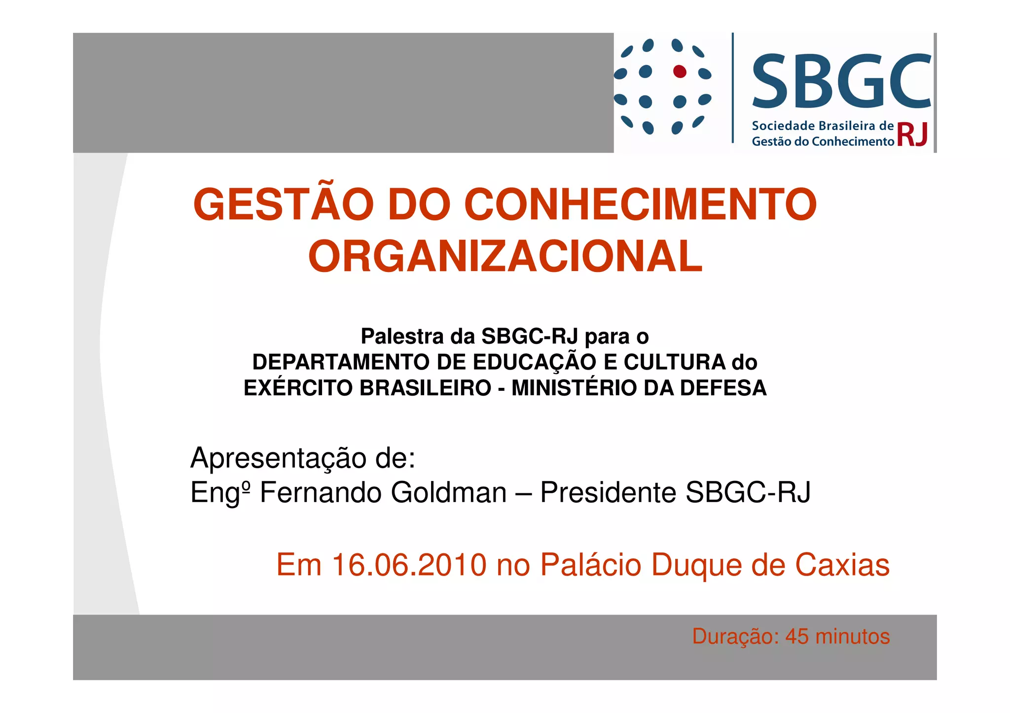 O documento apresenta uma palestra sobre gestão do conhecimento organizacional. A palestra discute tópicos como a diferença entre conhecimento e informação, três gerações de gestão do conhecimento, aprendizado organizacional, inovação, e um modelo para gestão do conhecimento nas organizações. O objetivo é explicar os conceitos e benefícios da gestão do conhecimento para as organizações.