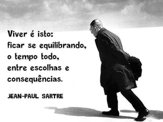 O documento descreve os princípios fundamentais do existencialismo de acordo com Jean-Paul Sartre. Sartre acreditava que os seres humanos não têm uma essência pré-determinada, e sim constroem seus próprios significados através de suas escolhas e ações. Ele defendia que os indivíduos são totalmente responsáveis por si mesmos e livres para escolherem seus caminhos, o que pode gerar angústia por causa das consequências de suas decisões.