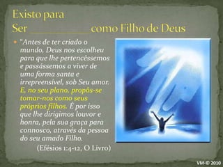 O documento discute as razões para a existência humana de acordo com a perspectiva cristã. Explica que existimos para (1) ser adotados como filhos de Deus através da fé em Jesus Cristo, (2) viver à imagem de Deus, e (3) cuidar da família de Deus e gerir os recursos da Terra.