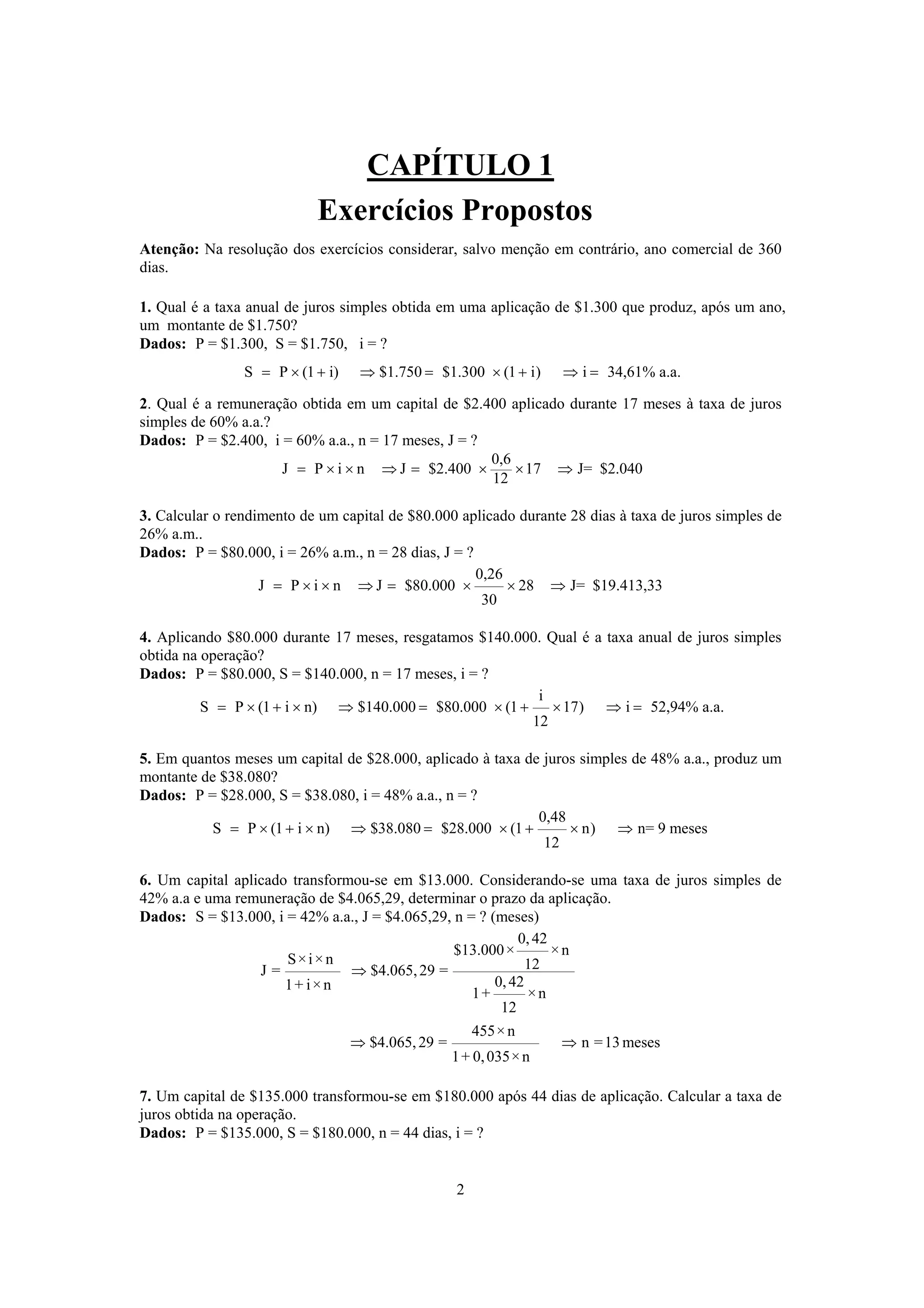 O documento apresenta 19 exercícios de juros simples e compostos envolvendo cálculo de taxas, montantes, capitais e prazos de aplicações. Os exercícios fornecem dados numéricos e pedem o cálculo de uma ou mais grandezas financeiras, como taxa, capital, rendimento ou prazo.
