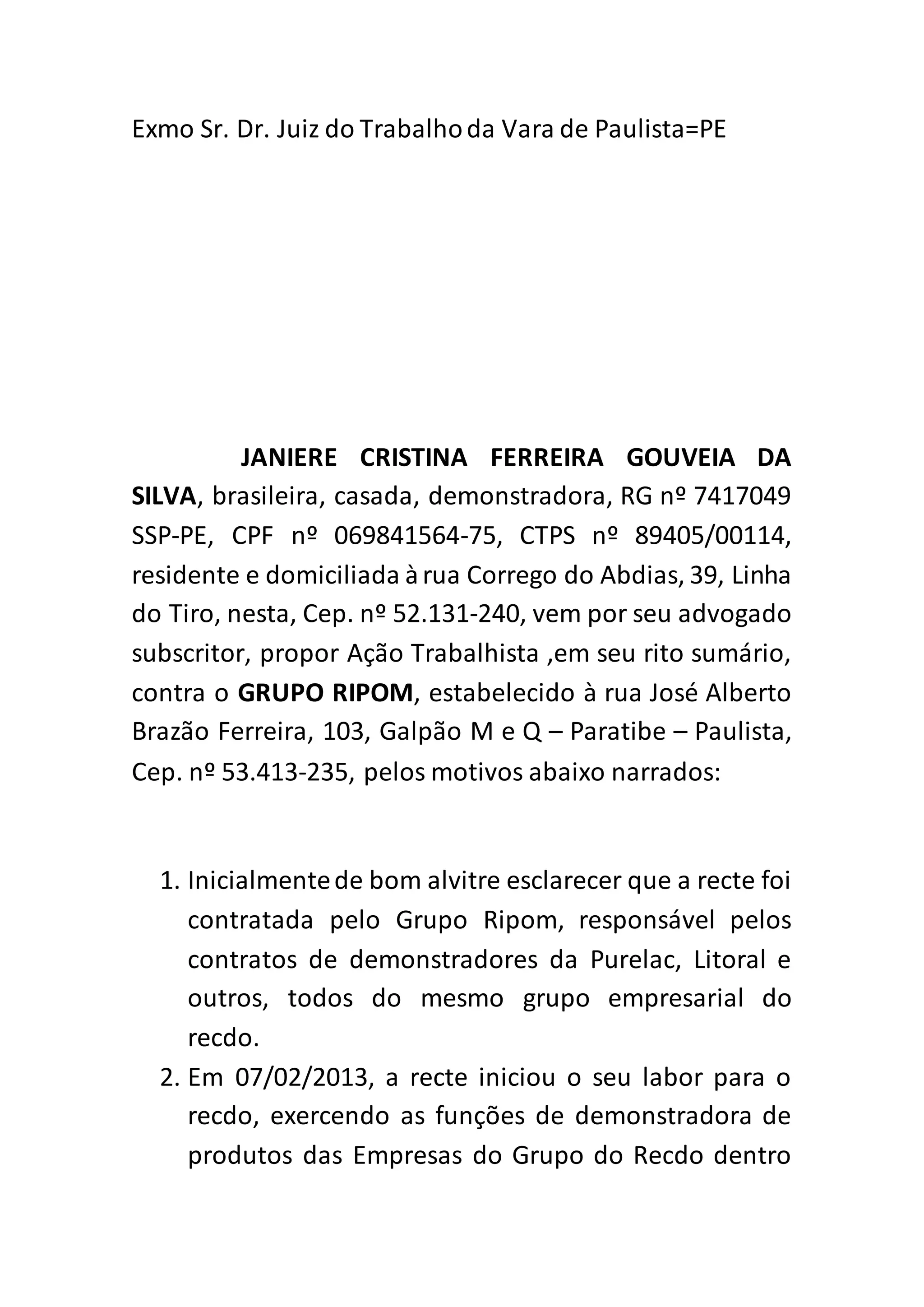 1. A autora Janiere Cristina Ferreira Gouveia da Silva move ação trabalhista contra o Grupo Ripom por salários atrasados e benefícios trabalhistas não pagos durante o período em que trabalhou como demonstradora de produtos para as empresas do grupo.