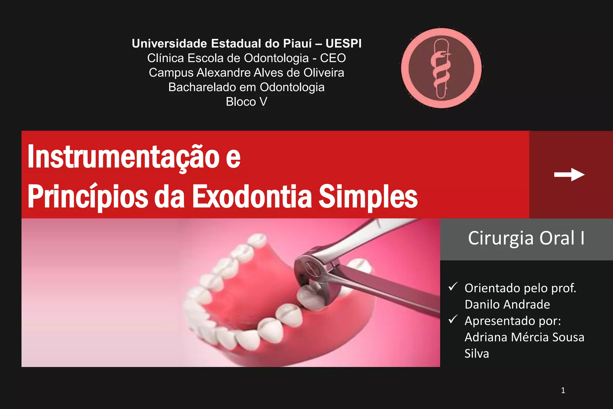 - O documento discute os princípios e técnicas da exodontia simples, incluindo a instrumentação, anestesia local, indicações e contraindicações para extração dentária.