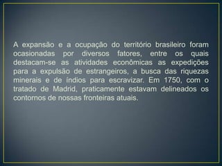 A ocupação e expansão do território brasileiro durante o século XVII ocorreu principalmente através de expedições em busca de riquezas minerais e escravos indígenas. Essas expedições resultaram no deslocamento e escravização de milhares de indígenas e na fundação de diversas cidades. O Tratado de Madrid de 1750 delineou as fronteiras atuais do Brasil.