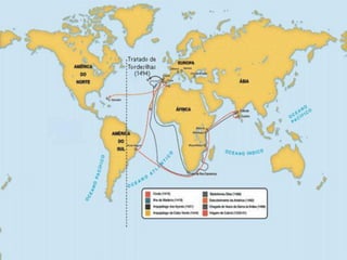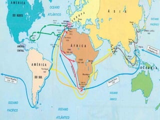 O documento descreve os fatores que levaram à expansão marítima europeia entre os séculos XV e XVI, incluindo a busca por novos mercados, especiarias e metais preciosos. Detalha os pioneiros portugueses nas navegações, como Bartolomeu Dias e Vasco da Gama, e as consequências dos descobrimentos, como o fim do monopólio árabe do comércio e a globalização do comércio.