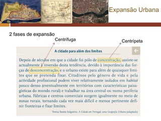 A expansão urbana ocorre em duas fases: centrípeta e centrífuga. A fase centrípeta caracteriza-se pela concentração populacional e econômica no centro da cidade, enquanto a fase centrífuga ocorre devido ao aumento dos preços no centro e leva à dispersão e crescimento das periferias e áreas suburbanas.