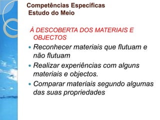Este documento descreve um projeto de ciências onde alunos exploram quais objetos flutuam ou afundam na água. Os alunos realizaram experiências colocando objetos como colheres, maçãs e esferovite na água e observaram seu comportamento. Eles concluíram que a flutuação depende da densidade do objeto em comparação com a densidade da água, não do tamanho ou peso do objeto.