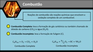 1) O documento discute reações de combustão completa e incompleta, onde a combustão completa forma dióxido de carbono e água e a incompleta forma fuligem.