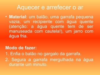 Este documento descreve um experimento para demonstrar como o calor e o frio afetam o volume do ar. O experimento envolve mergulhar uma garrafa com um balão no gargalo em água quente para inflar o balão, e então colocar a garrafa em água fria para esvaziar o balão, ilustrando como o calor faz o ar expandir e o frio faz o ar contrair.
