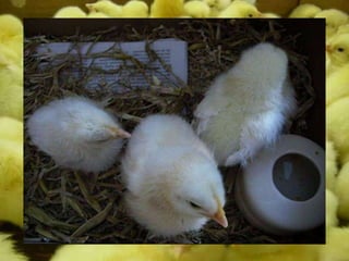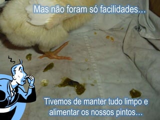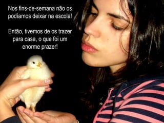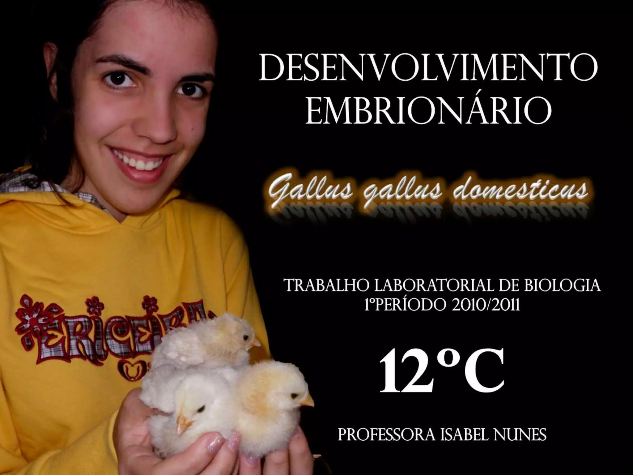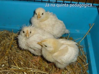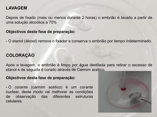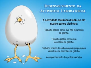 Este documento descreve um trabalho laboratorial sobre o desenvolvimento embrionário da galinha. O trabalho incluiu a observação de ovos não fecundados e fecundados, a incubação de ovos fecundados, a elaboração de preparações de embriões, e o nascimento e cuidado de pintos. Os estudantes observaram estruturas embrionárias em diferentes estágios de desenvolvimento e aprenderam novas técnicas laboratoriais. A taxa de nascimento foi de 50% dos ovos incubados.