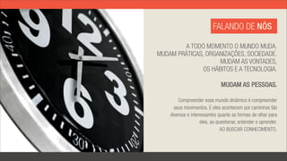 O documento descreve a Expertise, uma empresa especializada em pesquisa de mercado e inteligência competitiva. A Expertise oferece soluções personalizadas para entender as necessidades dos clientes e o mercado, utilizando uma equipe multidisciplinar e as mais modernas metodologias e técnicas de análise de dados. A Expertise busca entregar conhecimento de qualidade para apoiar as decisões e resultados dos clientes.