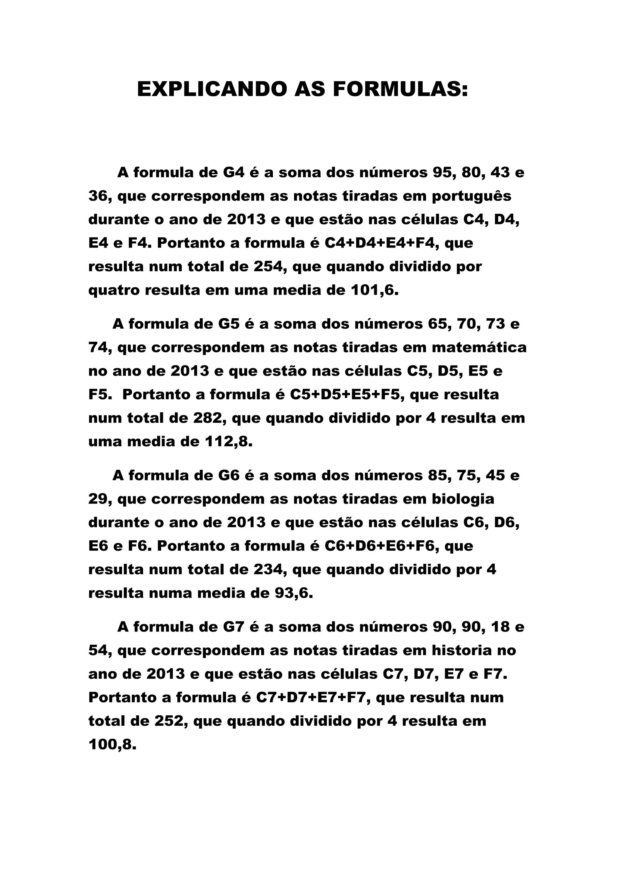O documento explica as fórmulas usadas em uma planilha para calcular as médias anuais de notas de diferentes disciplinas em 2013. As fórmulas somam as notas individuais de cada disciplina nas células C-F e dividem o total por 4 para obter a média anual.