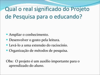 Qual o realsignificado do Projeto de Pesquisa para o educando? Ampliar o conhecimento. Desenvolver o gosto pela leitura. Levá-lo a uma extensão do raciocínio. Organização de métodos de pesquisa. Obs: O projeto é um auxilio importante para o aprendizado do aluno.