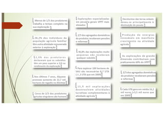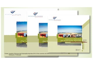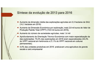 O documento resume os principais resultados do Inquérito à Estrutura das Explorações Agrícolas de 2016 em Portugal. Apresenta dados sobre o aumento da dimensão média das explorações e da sua dimensão económica entre 2013-2016, bem como sobre o envelhecimento dos produtores e a especialização crescente das explorações. Realça grandes variações regionais, com predomínio de minifúndios no Norte e Centro e de latifúndios no Alentejo.