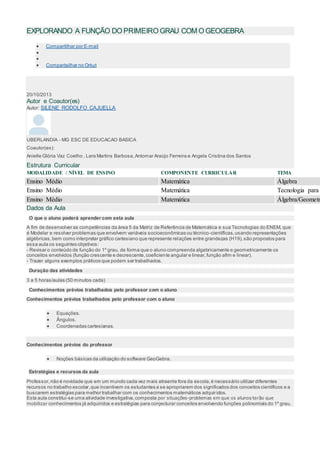 O documento apresenta uma aula sobre a função do primeiro grau utilizando o software GeoGebra. A aula é dividida em dois momentos: no primeiro, os alunos exploram comandos básicos do GeoGebra para construir gráficos de funções; no segundo, realizam atividades práticas com exemplos do mundo real modelados matematicamente. O objetivo é revisar conceitos algébricos e geométricos de função do primeiro grau de forma dinâmica e interativa.