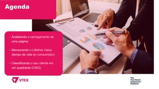 Este documento discute métricas avançadas para analisar o desempenho de e-commerce, incluindo o tempo de carregamento de páginas, cálculo de valor de vida do cliente e classificação de clientes em quadrantes com base em recorrência e valor médio de pedidos.