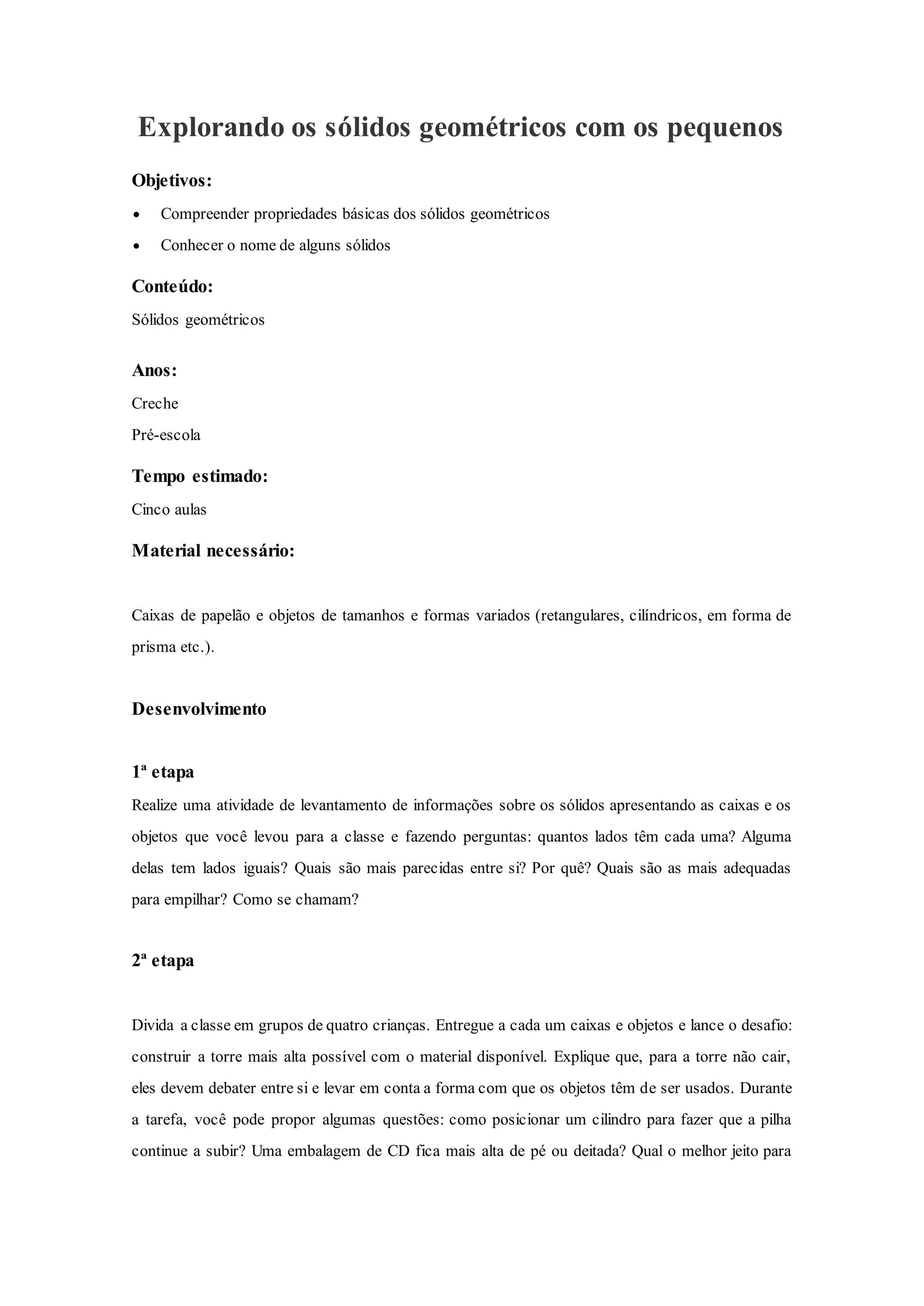 Este documento apresenta um plano de aula para introduzir crianças nos sólidos geométricos através de atividades práticas com caixas e objetos de diferentes formas. As crianças irão explorar as propriedades dos sólidos, classificá-los e aprender seus nomes por meio de jogos, construções e reflexões sobre as características de cada forma.