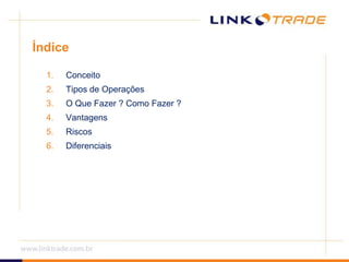 Este documento discute estratégias de long and short, incluindo conceitos, tipos de operações, vantagens, riscos e diferenciais. É fornecido um exemplo de relatório de trading idea demonstrando como abrir e fechar uma operação. Diferentes pares de ações são analisados, como ON x PN, holdings x subsidiárias e intra e intersetoriais.