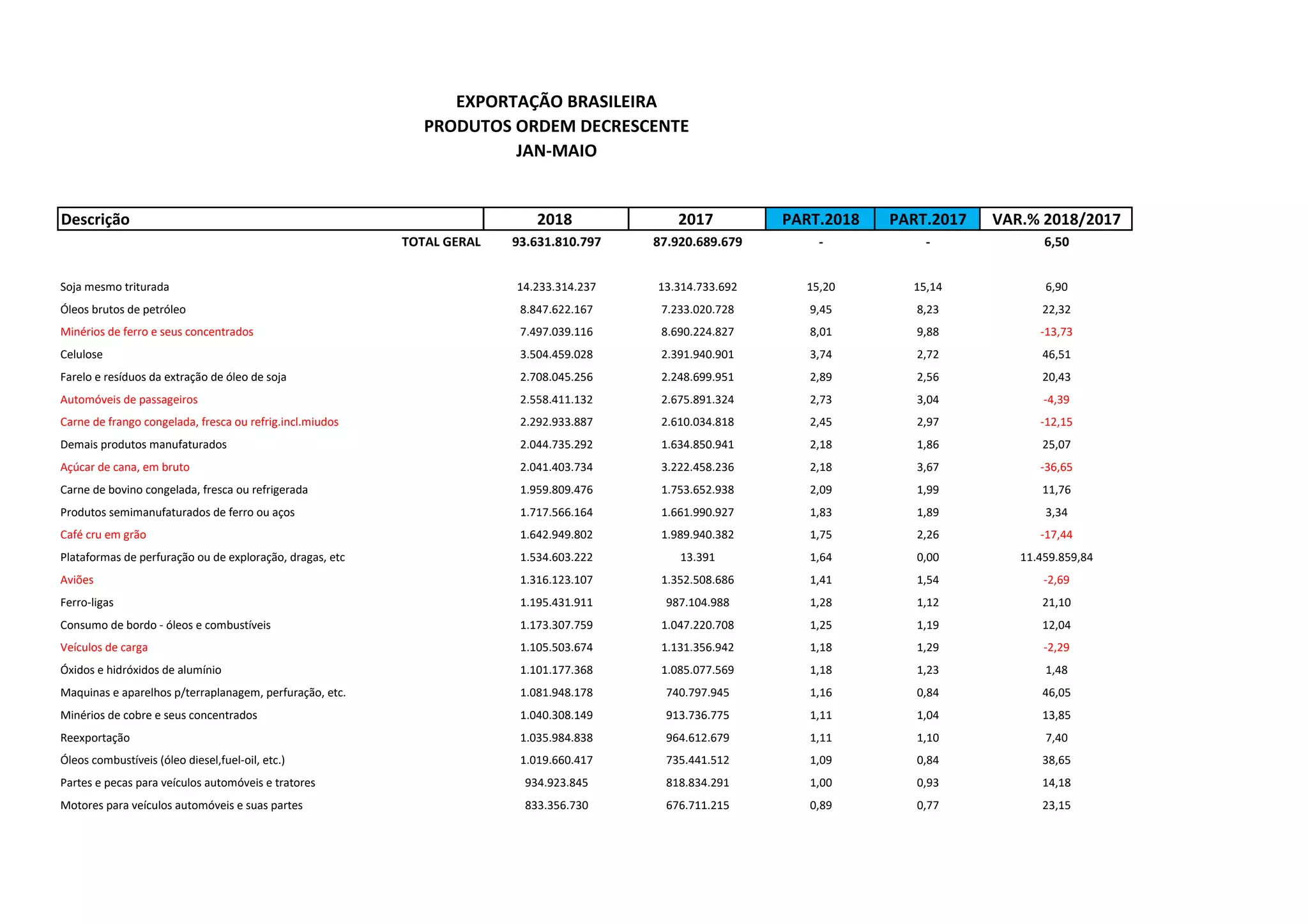 O documento fornece estatísticas sobre as exportações brasileiras de janeiro a maio de 2018, listando os 20 principais produtos exportados em ordem decrescente de valor. A soja mesmo triturada foi o produto mais exportado, respondendo por 15,2% das exportações totais, seguido por óleos brutos de petróleo com 9,45% e minérios de ferro com 8,01%. As exportações totais cresceram 6,5% em relação ao mesmo período de 2017.