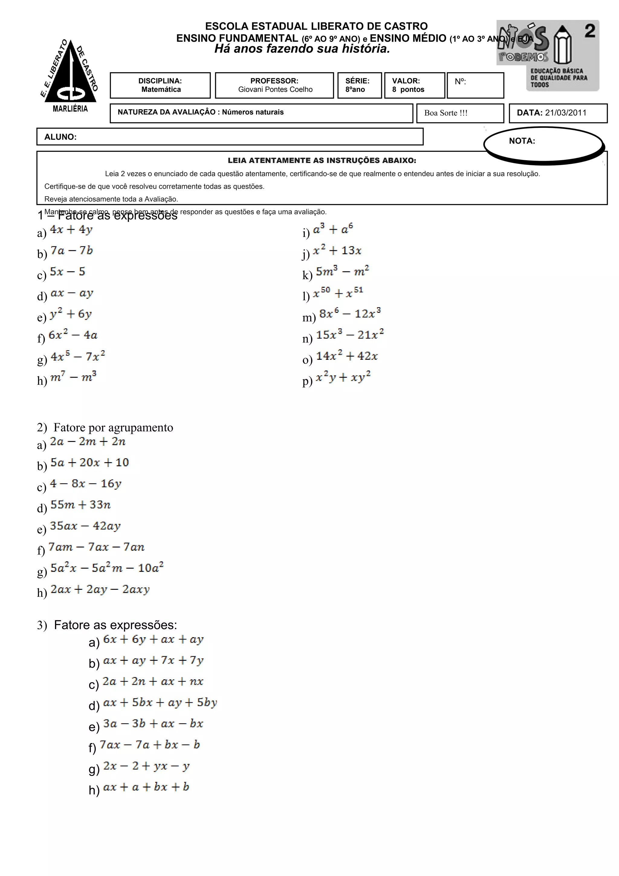 Este documento fornece instruções para um teste de matemática sobre fatoração de expressões algébricas. O teste contém três seções com várias questões de fatoração em cada seção. As instruções pedem aos alunos para ler atentamente os enunciados e certificar-se de que entenderam antes de responder, revisar cuidadosamente suas respostas e manter a calma.