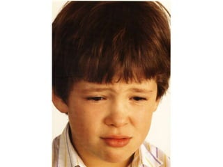O documento descreve as diferentes emoções de um menino, incluindo triste, feliz, bravo, satisfeito, assustado, surpreso, admirado, sério e com medo, terminando com ele alegre.