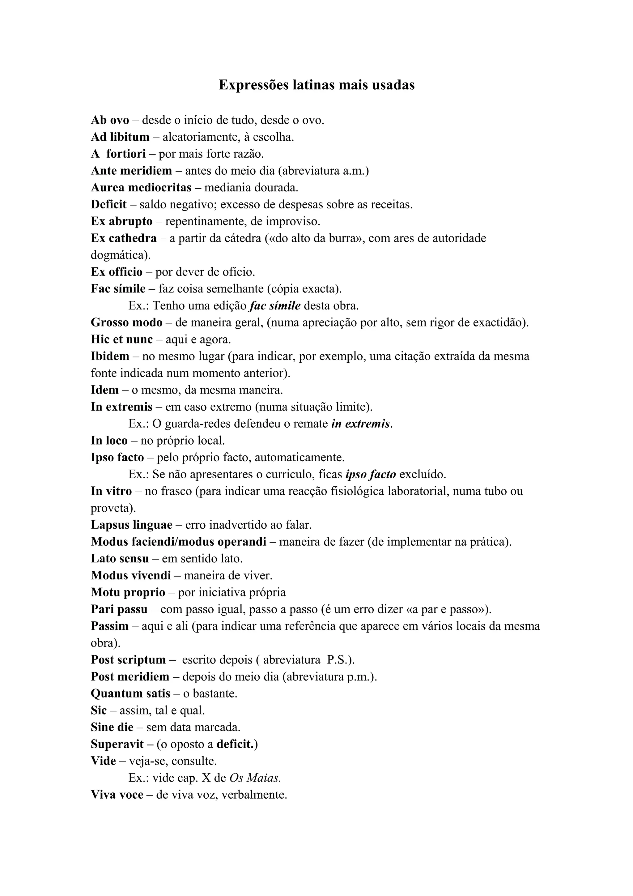 1) O documento lista e explica expressões latinas comumente usadas, como "ab ovo" que significa "desde o início de tudo, desde o ovo", "ad libitum" que significa "aleatoriamente, à escolha", e "a fortiori" que significa "por mais forte razão".