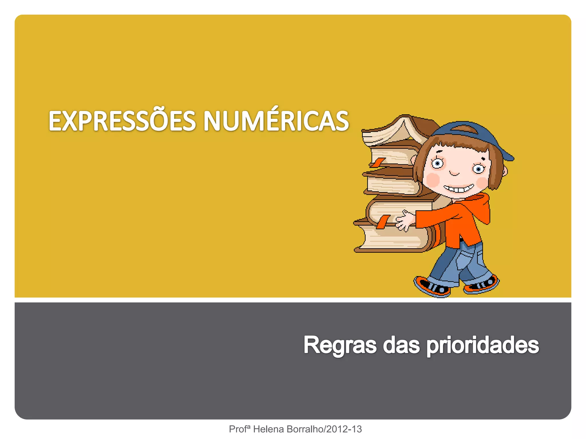 A professora apresenta vários exemplos numéricos para ensinar as regras de resolução de expressões matemáticas. As regras incluem: 1) calcular o que está dentro dos parêntesis primeiro, 2) multiplicar e dividir da esquerda para a direita antes de somar e subtrair.