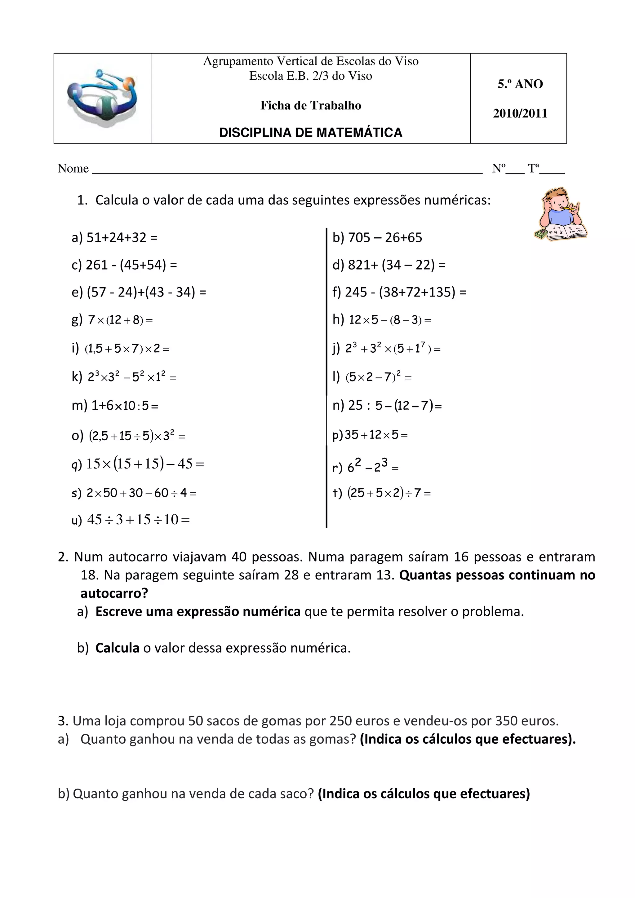 1) O documento é uma ficha de trabalho de matemática para alunos do 5o ano com vários exercícios de cálculo numérico e algébrico.