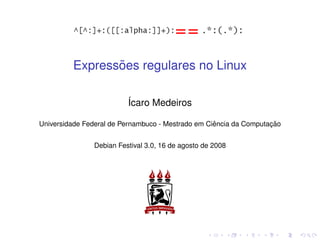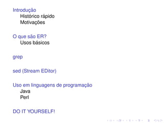 O documento discute expressões regulares (ER), sua história, usos básicos como grep e sed, aplicações em programação e desafios. ER permitem procurar padrões flexíveis em strings e editar arquivos de forma automatizada.