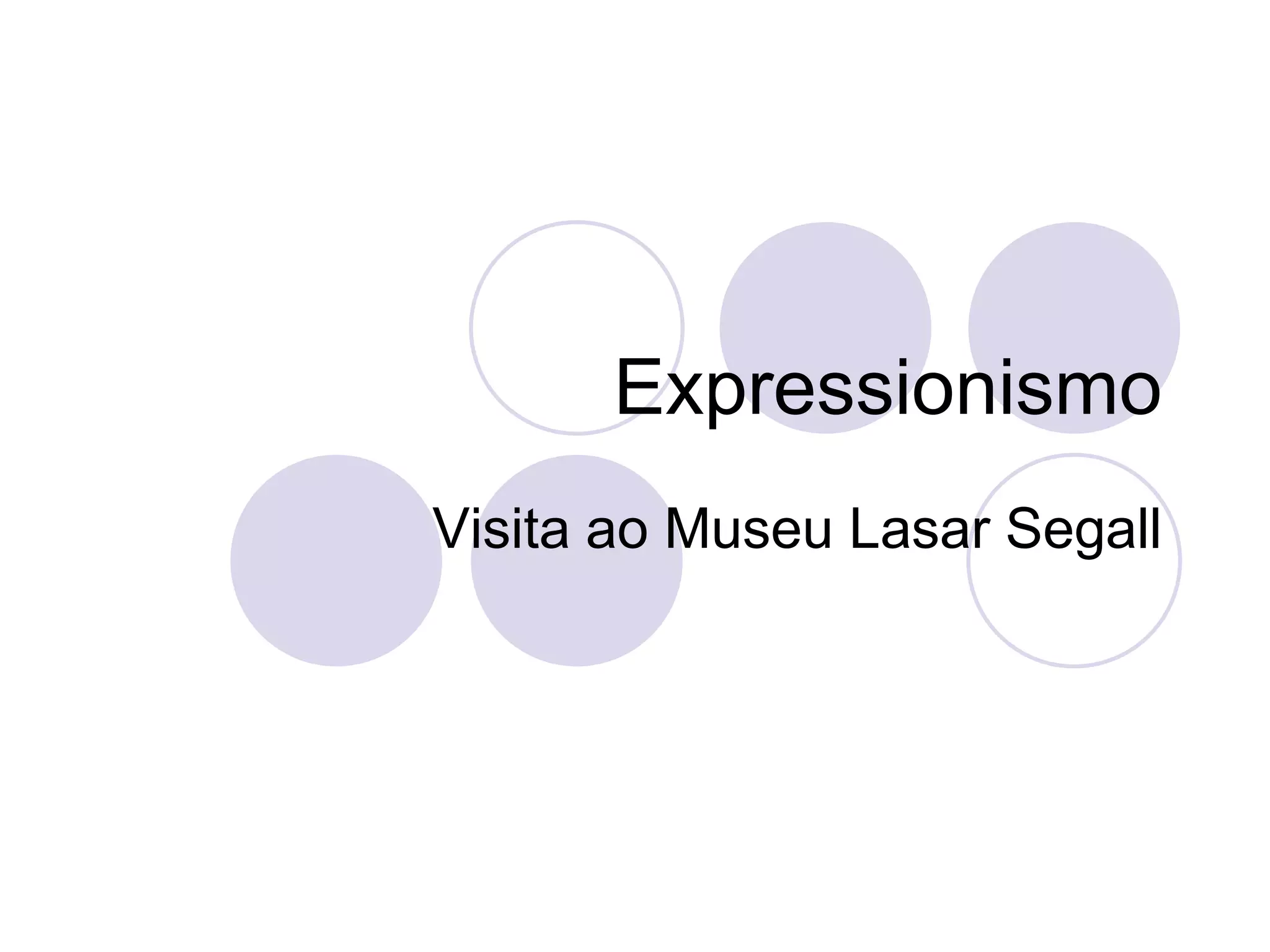 O expressionismo surgiu na Alemanha no século 19 e caracterizava-se por cores vibrantes e deformações da imagem para expressar emoções. No Brasil, os principais artistas expressionistas foram Candido Portinari, Anita Malfatti e Lasar Segall. A visita ao Museu Lasar Segall mostrou diversas obras do artista, como retratos, paisagens e cenas de favela, além de seu acervo pessoal.