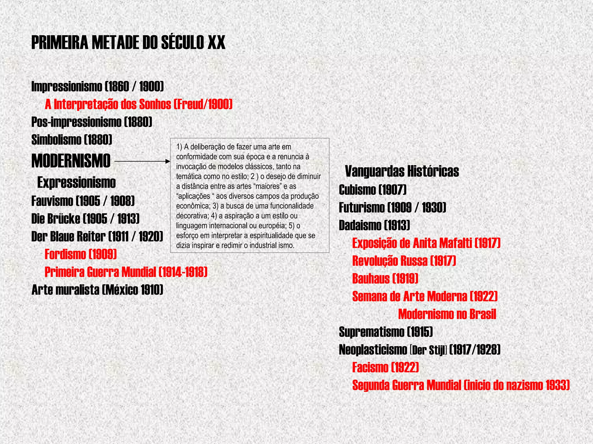 O documento resume os principais movimentos artísticos do início do século XX na Europa, incluindo o Impressionismo, Pós-Impressionismo, Simbolismo, Expressionismo, Fauvismo, Die Brücke, Der Blaue Reiter e outros. Destaca os principais artistas de cada movimento e suas obras mais representativas, demonstrando como exploraram novas formas de expressão através da cor, distorção e abstração.