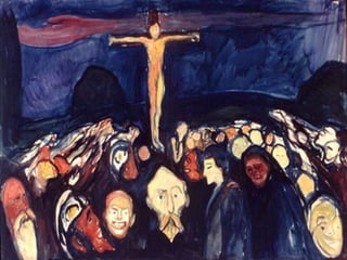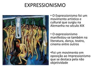 O documento descreve o movimento artístico Expressionismo que surgiu na Alemanha no século XIX em oposição ao Impressionismo. Caracteriza-se pela subjetividade e deformação da realidade para retratar os sentimentos e problemas sociais do mundo segundo a visão do artista. Menciona alguns dos principais nomes associados ao movimento como Van Gogh, Picasso e Munch.