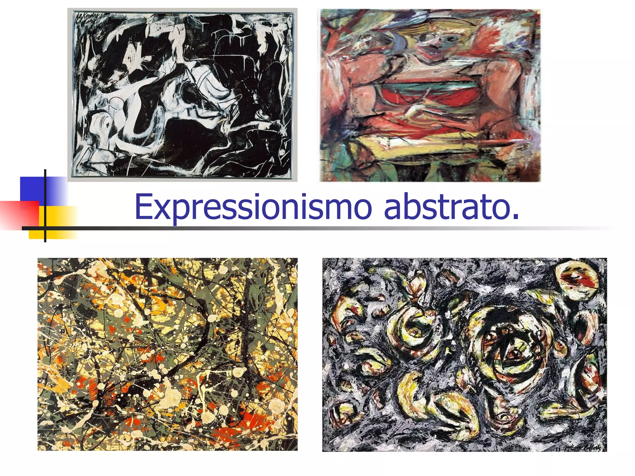 O Expressionismo Abstrato foi um movimento artístico americano pós-guerra que combinou a intensidade emocional do expressionismo alemão com a estética antifigurativa europeia. Caracterizava-se pela espontaneidade, liberdade do gesto e automatismo na execução, privilegiando Jackson Pollock, conhecido por suas action paintings criadas através do gotejamento sobre telas no chão.