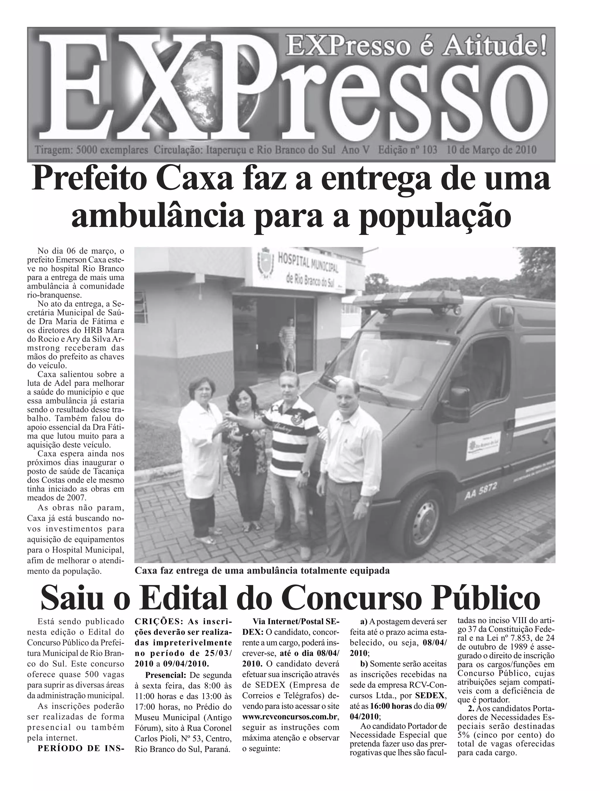 O prefeito Emerson Caxa entregou uma nova ambulância equipada para o Hospital Municipal Rio Branco. A secretária de saúde e diretores do hospital receberam as chaves. Caxa destacou os esforços para melhorar a saúde local e espera inaugurar em breve um novo posto de saúde.