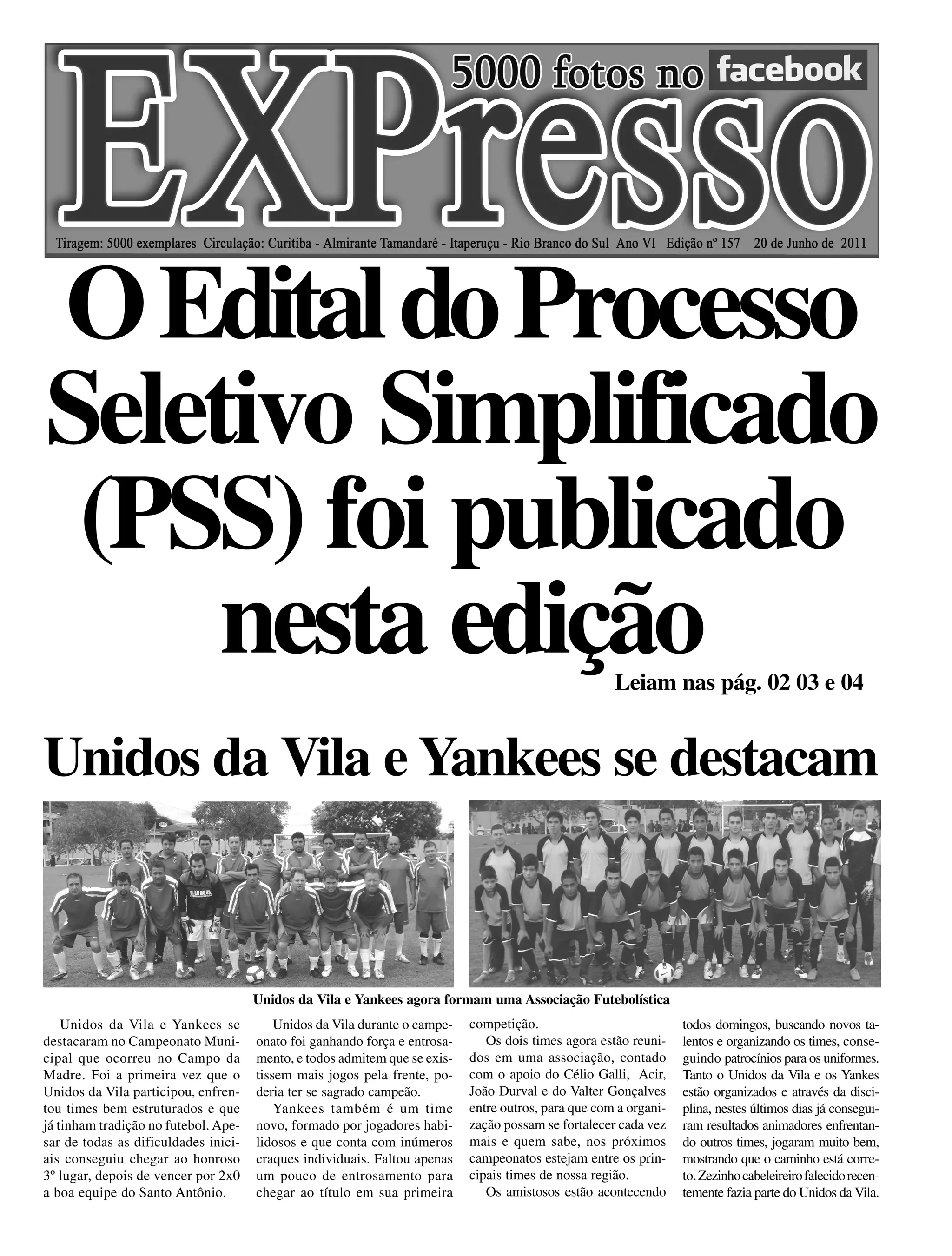 O documento relata que (1) o Unidos da Vila e o Yankees se destacaram em um campeonato municipal de futebol, (2) agora as duas equipes formaram uma associação para se fortalecerem, e (3) estão realizando amistosos aos domingos para recrutar novos talentos.