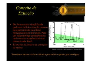O documento descreve a história da vida na Terra desde a Era Pré-Câmbrica até à atualidade, destacando os principais períodos geológicos e eventos de extinção em massa. Apresenta as cinco principais extinções reconhecidas, suas possíveis causas e impactos, com foco na extinção no limite Pérmico-Triássico e no limite Cretácico-Paleogénico. Por fim, discute se estamos vivendo atualmente a sexta extinção em massa e a importância da conservação da