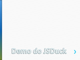 O documento é uma apresentação de um grupo de desenvolvedores de software que promove conhecimento na comunidade e fornece instruções sobre o uso da ferramenta Sencha Cmd para desenvolvimento de aplicações. Ele aborda a geração de workspaces, packages e aplicações, além de oferecer dicas sobre a organização de códigos e documentação. Há menções a recursos de descontos para eventos e e-books relacionados ao desenvolvimento.