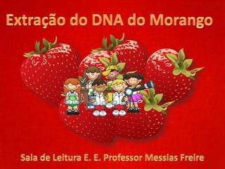 [1] Este documento descreve os passos para extrair DNA de morangos, incluindo macerar os morangos, preparar uma solução de extração com água, detergente e sal, misturar a solução com os morangos macerados, incubar e adicionar álcool para fazer o DNA precipitar.