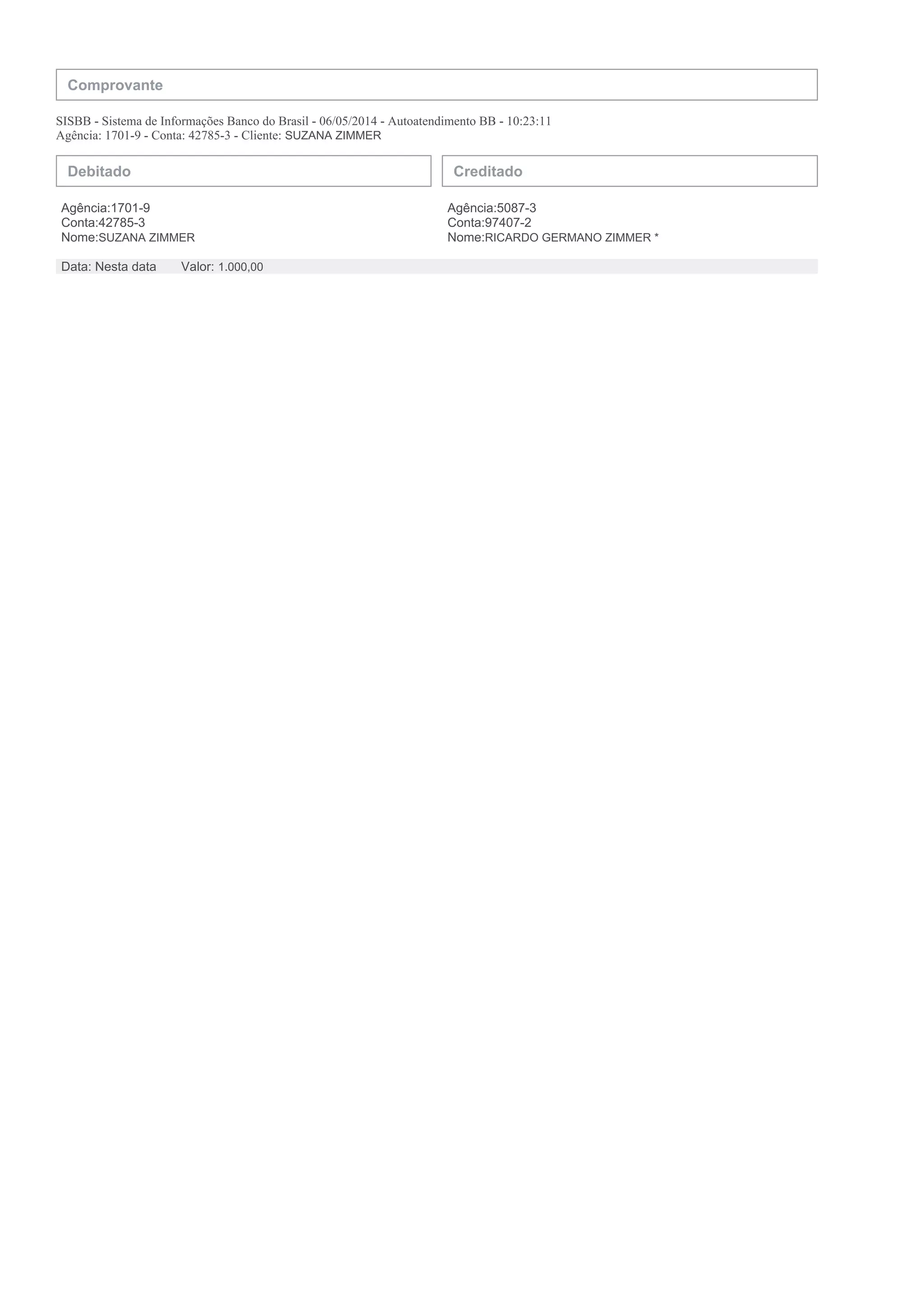 Este comprovante mostra uma transferência bancária de R$ 1.000,00 realizada em 06/05/2014 às 10:23:11 da conta da Sra. Suzana Zimmer na agência 1701-9 para a conta do Sr. Ricardo Germano Zimmer na agência 5087-3.