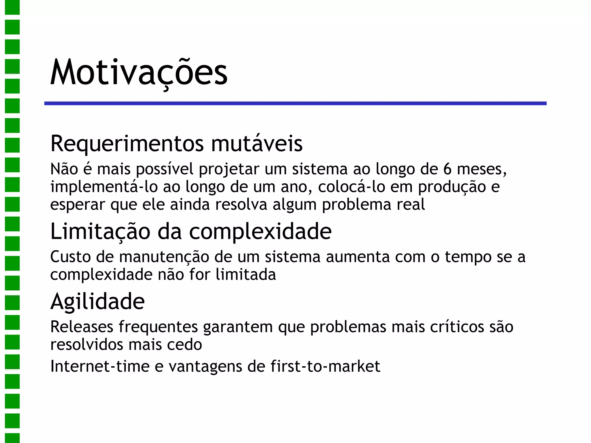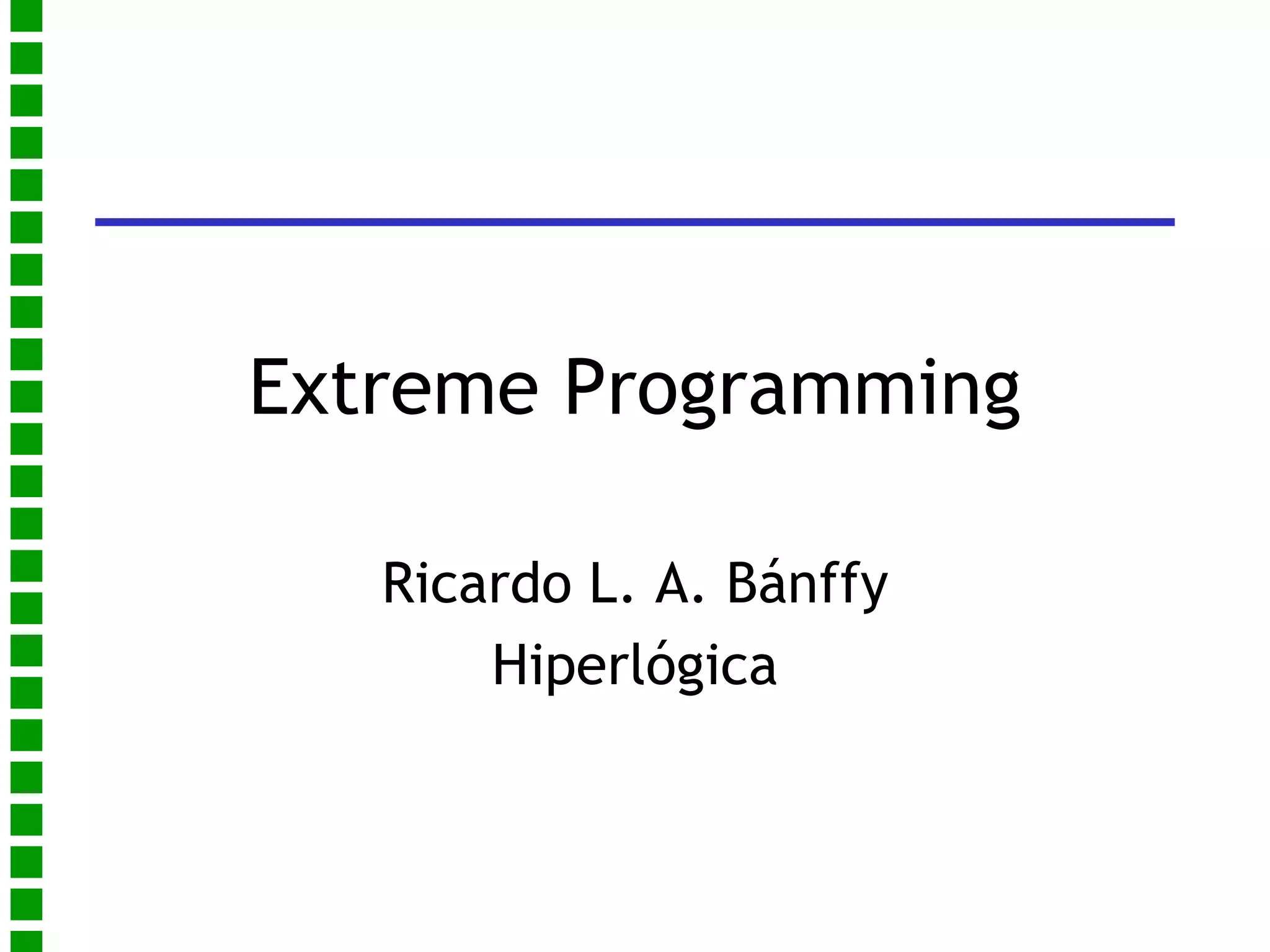 Extreme Programming (XP) é um framework ágil para desenvolvimento de software que propõe 12 práticas, incluindo releases frequentes, planejamento colaborativo, testes automatizados, pair programming e propriedade coletiva do código. O objetivo é entregar valor ao cliente rapidamente, manter a simplicidade e lidar com requisitos mutáveis.