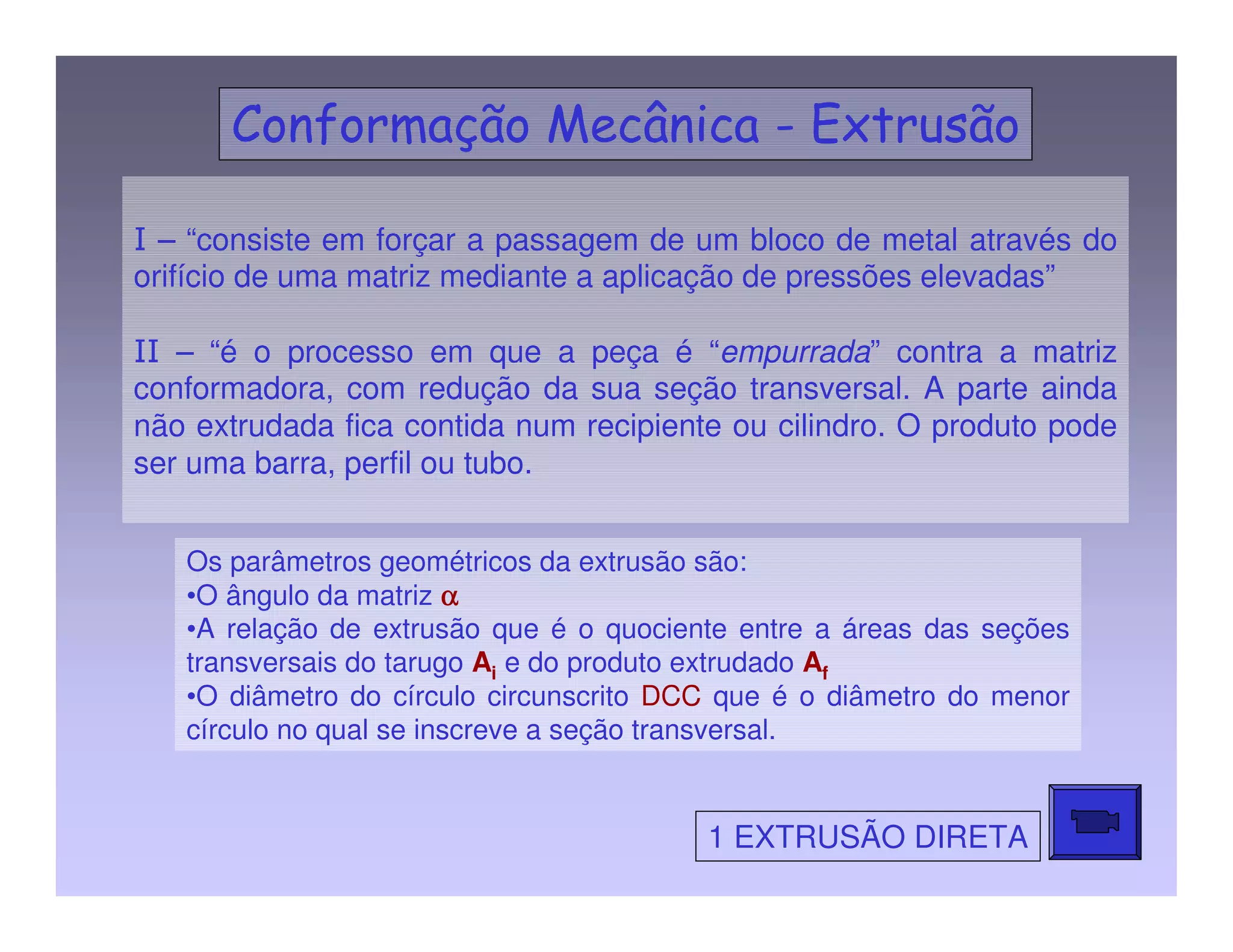 O documento descreve os processos de extrusão, incluindo extrusão direta, a quente e a frio. A extrusão direta envolve forçar um bloco de metal através de uma matriz usando pressão elevada. A extrusão a quente usa temperaturas mais altas e a extrusão a frio produz peças com melhores propriedades mecânicas. Vários tipos de extrusão são discutidos como a hidrostática e por impacto.