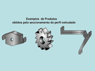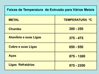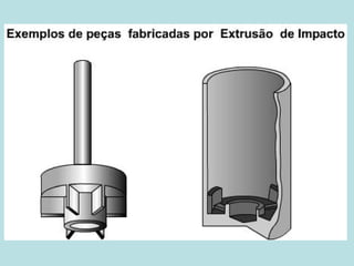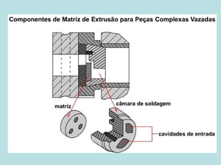 O documento descreve o processo de extrusão, no qual o material é forçado através de uma matriz, adquirindo a forma desejada. Detalha os tipos de extrusão, como direta, indireta e hidrostática, e os materiais mais comumente extrudados, como alumínio e aço. Também aborda defeitos como trincas e suas causas, como altas temperaturas ou velocidades.