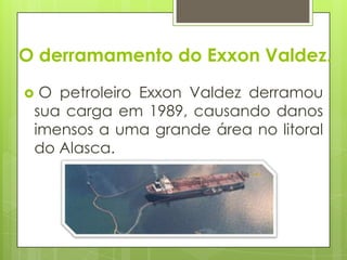 O petroleiro Exxon Valdez derramou 11 milhões de galões de óleo no mar da Alasca em 1989, poluindo 1.200 quilômetros quadrados e matando entre 100.000 e 700.000 pássaros. A recuperação da região continua incompleta, e o acidente levou a novas leis e práticas para prevenir e lidar com derrames de petróleo.