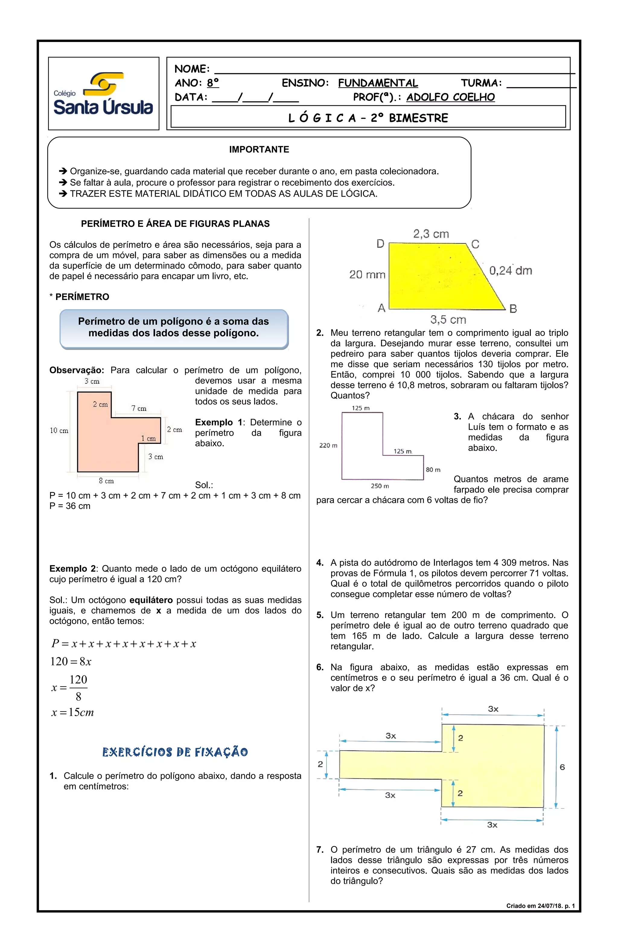 - O documento apresenta os conceitos de perímetro e área de figuras planas como polígonos, quadrados, retângulos, triângulos e paralelogramos. Fornece exemplos e exercícios de fixação para o cálculo do perímetro e área destas figuras.